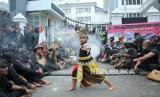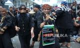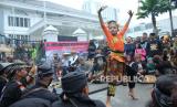 Atraksi seni dan budaya saat unjuk rasa Selamatkan Kebun Raya Bogor (KRB) yang digelar oleh massa dari Aliansi Komunitas Budaya dan Ormas Jawa Barat, di depan DPRD Jawa Barat, Jalan Diponegoro, Kota Bandung, Kamis (21/10). Aksi tersebut menolak adanya wisata malam dengan menggunakan cahaya lampu atau glow di KRB, serta menuntut kepada pemerintah daerah untuk mengembalikan marwah KRB dan fungsi KRB sebagai tempat konservasi, cagar budaya, rekreasi edukasi dan sejarah. (FOTO : Edi Yusuf/Republika)