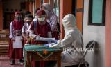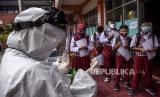 Sejumlah pelajar menunggu giliran untuk menjalani tes usap PCR di SDN 025 Cikutra, Jalan Cikutra, Kota Bandung, Jumat (22/10). Berdasarkan data dari Dinas Kesehatan Kota Bandung hingga Kamis (21/10), tercatat sebanyak 54 pelajar dan guru dari berbagai sekolah dinyatakan positif Covid-19 hasil tes usap PCR secara acak yang digelar dari 15 Oktober. Foto: Republika/Abdan Syakura (FOTO : REPUBLIKA/ABDAN SYAKURA)