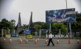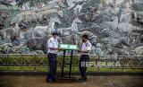 Petugas keamanan saat berjaga di pintu depan Taman Margasatwa Ragunan, Jakarta, Jumat (22/10). Taman Margasatwa Ragunan akan dibuka kembali untuk rekreasi masyarakat pada Sabtu (23/10), dengan syarat pengunjung harus sudah divaksin minimal dosis pertama, melakukan pendaftaran online sebelum kunjungan, memindai kode batang aplikasi PeduliLindungi pada pintu masuk dan hanya untuk pengunjung yang memiliki KTP DKI Jakarta. (FOTO : Republika/Putra M. Akbar)