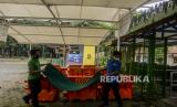 Petugas keamanan membawa papan pemindai kode batang PeduliLindungi di Taman Margasatwa Ragunan, Jakarta, Jumat (22/10). Taman Margasatwa Ragunan akan dibuka kembali untuk rekreasi masyarakat pada Sabtu (23/10), dengan syarat pengunjung harus sudah divaksin minimal dosis pertama, melakukan pendaftaran online sebelum kunjungan, memindai kode batang aplikasi PeduliLindungi pada pintu masuk dan hanya untuk pengunjung yang memiliki KTP DKI Jakarta. (FOTO : Republika/Putra M. Akbar)