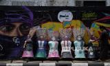 Rijal merapikan kerajinan ondel-ondel ukuran anak-anak yang ia jual di Pasar Minggu, Jakarta, Jumat (22/10/2021). Menteri Keuangan Sri Mulyani Indrawati menyebutkan anggaran pemulihan ekonomi nasional (PEN) telah terealisasi sebesar Rp428,21 triliun atau 57,5 persen dari pagu Rp744,77 triliun per 15 Oktober 2021. (FOTO : ANTARA/Sigid Kurniawan/foc.)