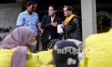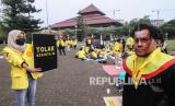 Sejumlah mahasiswa melakukan aksi di depan Gedung Rektorat, Universitas Indonesia, Depok, Jawa Barat, Jumat (22/10/2021). Aksi tersebut sebagai bentuk penolakan atas Peraturan Pemerintah (PP) Nomor 75 Tahun 2021 tentang Statuta Universitas Indonesia (UI) yang dianggap memiliki kecacatan secara formil maupun materiil serta menuntut pencabutan revisi Statuta UI. (FOTO : Antara/Asprilla Dwi Adha)
