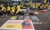 REPUBLIKA.CO.ID, DEPOK -- Mahasiswa melakukan aksi teatrikal di depan Gedung Rektorat, Universitas Indonesia, Depok, Jawa Barat, Jumat (22/10/2021). Aksi tersebut sebagai bentuk penolakan atas Peraturan Pemerintah (PP) Nomor 75 Tahun 2021 tentang Statuta Universitas Indonesia (UI) yang dianggap memiliki kecacatan secara formil maupun materiil serta menuntut pencabutan revisi Statuta UI.