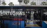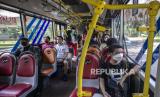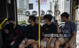REPUBLIKA.CO.ID,JAKARTA -- Sejumlah penumpang mengenakan masker dalam bus TransJakarta di kawasan Senayan, Jakarta, Ahad (24/10/2021).