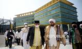 REPUBLIKA.CO.ID,JAKARTA -- Ketua Umum Partai Golkar Airlangga Hartarto bersama Pimpinan Majelis Ahbabul Musthofa Solo Jawa Tengah Habib Syech Bin Abdul Qodir Assegaf berjalan menuju lokasi peringatan Maulid Nabi Muhammad SAW dan peresmian Masjid Ainul Hikmah di Kantor DPP Partai Golkar, Jakarta, Ahad (24/10).