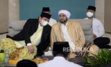 Ketua Umum Partai Golkar Airlangga Hartarto berbincang bersama Pimpinan Majelis Ahbabul Musthofa Solo Jawa Tengah Habib Syech Bin Abdul Qodir Assegaf saat menghadiri peringatan Maulid Nabi Muhammad SAW dan peresmian Masjid Ainul Hikmah di Kantor DPP Partai Golkar, Jakarta, Ahad (24/10). Kegiatan tersebut merupakan rangkaian Hari Ulang Tahun Partai Golkar ke 57 tahun sealigus untuk menumbuhkan spirit dalam menjalankan keteladanan Nabi Muhammad SAW dalam kehidupan berbangsa dan bernegara, juga sebagai bentuk rasa syukur karena Indonesia dengan ikhtiar dan kerja kerasnya sudah mulai pulih dari pandemi Covid-19. Prayogi/Republika. (FOTO : Prayogi/Republika.)