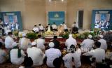 Ketua Dewan Kehormatan Partai Golkar Akbar Tanjung, Ketua Umum Partai Golkar Airlangga Hartarto, Pimpinan Majelis Ahbabul Musthofa Solo Jawa Tengah Habib Syech Bin Abdul Qodir Assegaf, Pengasuh Pondok Pesantren Tahfizh Daarul Qur (FOTO : Prayogi/Republika)
