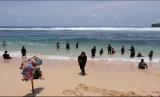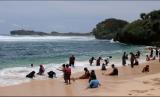 Wisatawan bermain di Pantai Sadranan Dusun Pulegundes, Sidoarjo, Tepus, Gunung Kidul, DI Yogyakarta, Ahad (24/10/2021). Sejak sepekan terakhir, seluruh kawasan wisata pantai di wilayah Kabupaten Gunung Kidul telah dibuka untuk umum dengan memberlakukan sistem ganjil genap untuk kendaraan roda empat ke atas guna mengurangi kepadatan pengunjung. (FOTO : Antara/Anis Efizudin)