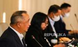 Direktur Utama BNI Royke Tumilaar (kiri) didampingi Direktur Keuangan BNI Novita Widya Anggraini (kedua kiri), dan Direktur Manajemen Risiko BNI David Pirzada (ketiga kiri) memberikan keterangan pers saat Public Expose BNI Q3 2021 di Jakarta, Senin (25/10/2021). Sampai dengan Kuartal 3 tahun 2021, BNI berhasil mencatat pertumbuhan laba bersih sebesar 73,9 persen secara Year on Year, yaitu dari Rp4,3 triliun pada Kuartal 3 2020 menjadi Rp7,7 triliun pada Kuartal 3 2021. Pertumbuhan laba ini utamanya berasal dari pertumbuhan Fee Based Income dan Net Interest Income masing-masing sebesar 16,8 persen dan 17,6 persen secara YoY. (FOTO : ANTARA/Rivan Awal Lingga)
