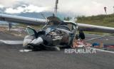 REPUBLIKA.CO.ID, ILAGA -- Pesawat jenis karavan milik maskapai Smart Air dengan registrasi PK-SNN mengalami kecelakaan di Bandara Aminggaru Ilaga, Kabupaten Puncak, Papua, Senin (25/10/2021). Kecelakaan pesawat kargo diduga akibat cuaca buruk tersebut mengakibatkan pilot meninggal dunia.