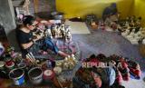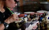 Pengerajin melukis pesanan cendera mata patung dari kayu di Sanggar Diponegoro, Bantul, Yogyakarta, Senin (25/10). Dibukanya sektor pariwisata saat PPKM level 3 membawa berkah bagi pembuat sovenir dan cenderamata. Pesanan cenderamata dari Yogyakarta, Solo, dan Bali mulai datang kembali. Cenderamata dijual mulai Rp 12 ribuan tergantung dari bahan dan modelnya. (FOTO : Wihdan Hidayat / Republika)