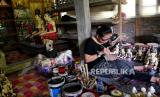Pengerajin melukis pesanan cenderamata patung dari kayu di Sanggar Diponegoro, Bantul, Yogyakarta, Senin (25/10). Dibukanya sektor pariwisata saat PPKM level 3 membawa berkah bagi pembuat sovenir dan cenderamata. Pesanan cenderamata dari Yogyakarta, Solo, dan Bali mulai datang kembali. Cenderamata dijual mulai Rp 12 ribuan tergantung dari bahan dan modelnya. (FOTO : Wihdan Hidayat / Republika)