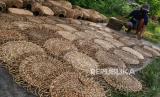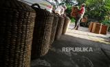 Pekerja mengambil kerajinan enceng gondok usai penjemuran di Srandakan, Bantul, Yogyakarta, Senin (25/10). Kerajinan dari enceng gondok ini untuk memenuhi pasar Eropa dan Amerika. Di sini hanya tempat finishing kerajinan enceng gondok sebelum diekspor. Pesanan mulai meningkat kembali setelah turun pada awal pandemi Covid-19 lalu. (FOTO : Wihdan Hidayat / Republika)