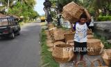 Pekerja membawa kerajinan enceng gondok usai penjemuran di Srandakan, Bantul, Yogyakarta, Senin (25/10). Kerajinan dari enceng gondok ini untuk memenuhi pasar Eropa dan Amerika. Di sini hanya tempat finishing kerajinan enceng gondok sebelum diekspor. Pesanan mulai meningkat kembali setelah turun pada awal pandemi Covid-19 lalu. (FOTO : Wihdan Hidayat / Republika)