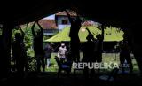 Personel TNI dan Polri mendirikan tenda posko pengungsian sementara untuk warga terdampak gempa bumi di Kelurahan Pojoksari, Ambarawa, Kabupaten Semarang, Jawa Tengah, Senin (25/10/2021). Peristiwa gempa bumi tektonik jenis Swarm (gempa dangkal bermagnitudo kecil dengan frekuensi sering) 3 SR sejak Sabtu (23/10) dan gempa susulan kurang dari 3 SR hingga Senin (25/10) pagi dengan total 34 gempa di Ambarawa dan sekitarnya tidak menimbulkan korban jiwa dan kerusakan berat pada permukiman warga. (FOTO : Antara/Aji Styawan)