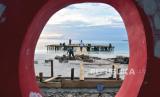 Sejumlah pekerja menyelesaikan pembuatan panggung di tepi Pantai Ngur Bloat, Kabupaten Maluku Tenggara, Provinsi Maluku, Selasa (26/10/2021). Pemkab Maluku Tenggara mengemas fenomena alam surutnya air laut yang disebut masyarakat setempat dengan Meti, sebagai acara potensi wisata berupa Festival Pesona Meti Kei 2021 yang puncaknya akan berlangsung pada 28 Oktober 2021.  (FOTO : ANTARA/FB Anggoro)