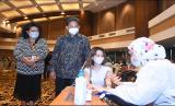 Direktur Utama Bank Mega Kostaman Thayib didampingi Corporate Secretary Christiana M. Damanik, meninjau pelaksanaan pemberian vaksinasi Covid 19 jenis Pfizer di Menara Bank Mega - Jakarta bagi nasabah dan masyarakat hingga akhir November 2021 yang merupakan kelanjutan dari program vaksinasi sebelumnya, Senin (25/10/2021).  (FOTO : Dok Bank Mega)