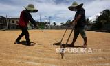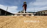 Pekerja menjemur gabah di sebuah tempat penggilingan padi di Kabupaten Aceh Besar, Aceh, Selasa (26/10/2021). Persatuan Pengusaha Penggilingan Padi (Perpadi) Aceh menyebutkan harga gabah di tingkat petani pada musim panen Oktober 2021 untuk gabah kering panen (GKP) Rp4.700 hingga Rp5.000 per kilogram atau lebih tinggi dari harga pembelian Pemerintah yang hanya Rp4.200 per kilogram. (FOTO : Antara/Irwansyah Putra)