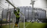 Pekerja saat memasang jaring gawang dengan latar belakang pembangunan Jakarta International Stadium (JIS) di kawasan Papanggo, Jakarta, Selasa (26/10). PT Jakarta Propertindo (Jakpro) mencatat pembangunan JIS yang berkapasitas 82.000 penonton itu telah mencapai 76,52 persen dan ditargetkan diresmikan pada Maret 2022 mendatang. Republika/Putra M. Akbar (FOTO : Republika/Putra M. Akbar)