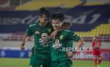 Pesepak bola Persebaya Surabaya Teisei Marukawa (kanan) melakukan selebrasi dengan Akbar Firmansyah (kiri) usai mencetak gol gawang Persija Jakarta pada pertandingan BRI Liga I di Stadion Manahan, Solo, Jawa Tengah, Selasa (26/10/2021). (FOTO : ANTARA FOTO/Mohammad Ayudha)