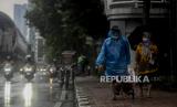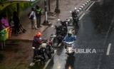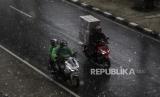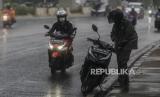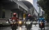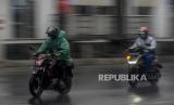 Pengendara motor memakai mantel saat hujan di kawasan Kuningan, Jakarta, Rabu (27/10). Badan Meteorologi, Klimatologi dan Geofisika (BMKG) menyampaikan peringatan dini waspada fenomena La Nina menjelang akhir tahun 2021 yang menyebabkan peningkatan curah hujan. Republika/Putra M. Akbar (FOTO : Republika/Putra M. Akbar)