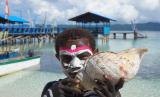 REPUBLIKA.CO.ID,RAJA AMPAT -- Seorang anak kampung Arborek meniup kulit Bia alat musik khas Papua di pantai Kampung Arborek, Kabupaten Raja Ampat, Papua Barat, Rabu (27/10/2021).