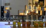 Penjaga stand menata produk yang dipamerkan pada acara Indonesia Sharia Economic Festival (ISEF) 2021, Jakarta, Rabu (27/10). Layanan Syariah LinkAja turut berkontribusi dalam event ekonomi dan keuangan syariah terbesar di Indonesia yakni ISEF 2021 sebagai satu-satunya penyedia QRIS serta uang layanan elektronik pada acara exhibition offline.Prayogi/Republika. (FOTO : Prayogi/Republika.)