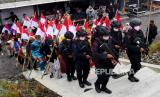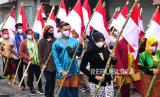 Anggota Brimob bersama mahasiswa dari Aliansi Mahasiswa Nusantara menggunakan baju adat berjalan menuju lokasi upacara Hari Sumpah Pemuda di Bungker Kali Adem, Cangkringan, Sleman, Yogyakarta, Kamis (28/10). Sebanyak 28 mahasiswa dengan baju adat dan anggota Brimob Gondowulung mengadakan upacara menyambut Hari Sumpah Pemuda. Pada tahun ini mengangkat tema dengan semangat sumpah pemuda, menjunjung tinggi sportifitas diri masa pandemi. Upacara peringatan ini bisa dilakukan saat pandemi Covid-19 dengan menggunakan protokol kesehatan Covid-19 ketat. (FOTO : Wihdan Hidayat / Republika)