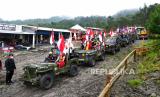 Anggota Brimob bersama mahasiswa dari Aliansi Mahasiswa Nusantara menggunakan baju adat naik jip wisata menuju lokasi upacara Hari Sumpah Pemuda di Bungker Kali Adem, Cangkringan, Sleman, Yogyakarta, Kamis (28/10). Sebanyak 28 mahasiswa dengan baju adat dan anggota Brimob Gondowulung mengadakan upacara menyambut Hari Sumpah Pemuda. Pada tahun ini mengangkat tema dengan semangat sumpah pemuda, menjunjung tinggi sportifitas diri masa pandemi. Upacara peringatan ini bisa dilakukan saat pandemi Covid-19 dengan menggunakan protokol kesehatan Covid-19 ketat. (FOTO : Wihdan Hidayat / Republika)