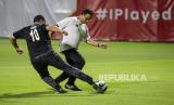 Gubernur DKI Jakarta Anies Baswedan (kanan) berusaha melewati hadangan pesepak bola tim DPRD DKI Jakarta saat uji coba lapangan latih di Jakarta International Stadium, (JIS) di Tanjung Priok, Jakarta Utara, Kamis (28/10/2021). Pertandingan persahabatan yang digelar PT Jakarta Propertindo (Jakpro) Perseroda tersebut adalah bagian langkah pembuktian bahwa dua lapangan latih JIS yang berstandar internasional kini sudah bisa dimanfaatkan untuk berbagai kegiatan masyarakat. (FOTO : ANTARA/M Risyal Hidayat)