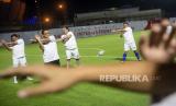 Gubernur DKI Jakarta Anies Baswedan (kedua kiri) melakukan pemanasan saat akan melawan tim DPRD DKI Jakarta saat uji coba lapangan latih di Jakarta International Stadium, (JIS) di Tanjung Priok, Jakarta Utara, Kamis (28/10/2021). Pertandingan persahabatan yang digelar PT Jakarta Propertindo (Jakpro) Perseroda tersebut adalah bagian langkah pembuktian bahwa dua lapangan latih JIS yang berstandar internasional kini sudah bisa dimanfaatkan untuk berbagai kegiatan masyarakat. (FOTO : ANTARA/M Risyal Hidayat)