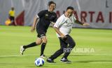 Kepala Dinas Bina Marga DKI Jakarta Hari Nugroho (kiri) menendang bola dengan dihadang pesepak bola tim DPRD DKI Jakarta saat uji coba lapangan latih di Jakarta International Stadium, (JIS) di Tanjung Priok, Jakarta Utara, Kamis (28/10/2021). Pertandingan persahabatan yang digelar PT Jakarta Propertindo (Jakpro) Perseroda tersebut adalah bagian langkah pembuktian bahwa dua lapangan latih JIS yang berstandar internasional kini sudah bisa dimanfaatkan untuk berbagai kegiatan masyarakat. (FOTO : ANTARA/M Risyal Hidayat)