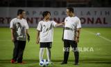 Gubernur DKI Jakarta Anies Baswedan (kanan) berbincang dengan anaknya Ismail Hakim Baswedan (tengah) berdampingan dengan Wakil Gubernur Ahmad Riza Patria (kiri) saat akan melawan tim DPRD DKI Jakarta saat uji coba lapangan latih di Jakarta International Stadium, (JIS) di Tanjung Priok, Jakarta Utara, Kamis (28/10/2021). Pertandingan persahabatan yang digelar PT Jakarta Propertindo (Jakpro) Perseroda tersebut adalah bagian langkah pembuktian bahwa dua lapangan latih JIS yang berstandar internasional kini sudah bisa dimanfaatkan untuk berbagai kegiatan masyarakat. (FOTO : ANTARA/M Risyal Hidayat)