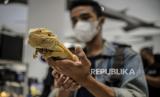 Pengunjung memegang biawak pada pameran Exotique Pet Expo di Senayan Park, Jakarta, Sabtu (30/10). Acara yang menampilkan berbagai jenis hewan eksotis itu bertujuan untuk mengenalkan dan mengedukasi masyarakat mengenai keberagaman hewan serta kiat-kiat perawatannya yang diselenggarakan hingga Ahad (31/10). (FOTO : Republika/Putra M. Akbar)