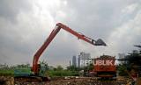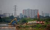 Petugas dengan menggunakan alat berat untuk mengeruk sampah bercampur lumpur di aliran Banjir Kanal Barat, Jakarta, Ahad (31/10). Pemprov DKI Jakarta terus melakukan pengerukan serta pembersihan waduk, sungai dan saluran air dari lumpur dan sampah untuk mencegah pendangkalan dan mengantisipasi banjir saat musim hujan. (FOTO : Prayogi/Republika.)