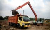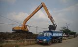 REPUBLIKA.CO.ID,JAKARTA -- Petugas dengan menggunakan alat berat untuk mengeruk sampah bercampur lumpur di aliran Banjir Kanal Barat, Jakarta, Ahad (31/10).