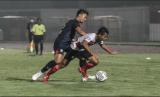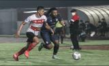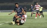 Pesepak bola Arema FC Rizky Dwi (kiri) berebut bola dengan pesepak bola Madura United Moch Kevy (kanan) saat pertandingan Liga 1 di Stadion Sultan Agung, Bantul, DI Yogyakarta, Senin (1/11/2021). Arema FC berhasil mengalahkan Madura United dengan skor 2-1. (FOTO : Antara/Hendra Nurdiyansyah)