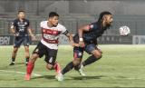 Pesepak bola Arema FC Dedik Setiawan (kiri) berebut bola dengan pesepak bola Madura United Novan Setya (kanan) saat pertandingan Liga 1 di Stadion Sultan Agung, Bantul, DI Yogyakarta, Senin (1/11/2021). Arema FC berhasil mengalahkan Madura United dengan skor 2-1. (FOTO : Antara/Hendra Nurdiyansyah)