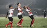 Pesepak bola Madura United Rafael Silva (kanan) melakukan selebrasi dengan rekannya Jaime Xavier (tengah) dan Bayu Gatra (kiri) usai mencetak gol ke gawang Arema FC saat pertandingan Liga 1 di Stadion Sultan Agung, Bantul, DI Yogyakarta, Senin (1/11/2021). Arema FC berhasil mengalahkan Madura United dengan skor 2-1. (FOTO : Antara/Hendra Nurdiyansyah)