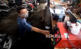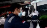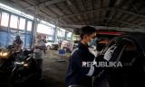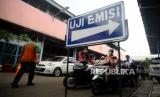 Petugas Dinas Lingkungan Hidup DKI Jakarta menguji emisi kendaraan bermotor di bengkel Dinas Lingkungan Hidup, Cililitan, Jakarta, Kamis (4/11). Dinas Lingkungan Hidup DKI Jakarta melayani uji emisi kendaraan bermotor gratis untuk sepeda motor maupun mobil yang dibuka setiap Selasa dan Kamis untuk menekan tingkat pencemaran udara di Ibu Kota. Banyaknya warga yang ingin uji emisi mengakibatkan antrean panjang dan dibuka sejak pukul 08.00 WIB hingga pukul 14.00 WIB. (FOTO : Prayogi/Republika.)