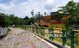 Taman Gajahwong ditutup sementara imbas tanah longsor di Yogyakarta, Kamis (4/11). Curah hujan yang tinggi beberapa hari terakhir mengakibatkan tanah longsor di samping Taman Gajahwong. Imbasnya Taman Gajahwong sebagian ikut longsor diterjang air yang sungai. Karena jalur aliran air tertutup material longsoran. Untuk sementara Taman Gajahwong ditutup untuk aktivitas warga. (FOTO : Wihdan Hidayat / Republika)