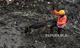 Tim SAR menggunakan anjing pelacak untuk mencari korban di antara reruntuhan rumah dan endapan lumpur akibat banjir bandang di Bulukerto, Kota Batu, Jawa Timur, Jumat (5/11/2021). Berdasarkan laporan sementara dari BPBD Kota Batu hingga hari kedua pencarian korban banjir bandang, tim SAR berhasil menemukan enam jenazah korban dan tiga korban masih dalam proses pencarian. (FOTO : ANTARA FOTO/Zabur Karuru/aww.)