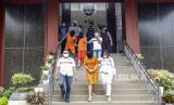 Petugas Sat Narkoba Polres Bogor menggiring tersangka saat rilis kasus narkotika jenis sabu di Polres Bogor, Cibinong, Kabupaten Bogor, Jawa Barat, Jumat (5/11/2021). Polres Bogor dan Ditnarkoba Polda Jawa Barat dalam kurun waktu sepekan berhasil mengungkap tiga kasus peredaran gelap narkotika jenis sabu sebanyak 5.582,28 gram atau 5,6 kilogram dari tiga orang tersangka. (FOTO : ANTARA/Yulius Satria Wijaya)