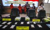 Kabid Humas Polda Jawa Barat Kombes Pol Erdi A Chaniago (kiri) dan Direktur Reserse Narkoba Kombes Pol Rudy Ahmad Sudrajat (kedua kiri) menunjukkan barang bukti sabu saat rilis di Polres Bogor, Cibinong, Kabupaten Bogor, Jawa Barat, Jumat (5/11/2021). Polres Bogor dan Ditnarkoba Polda Jawa Barat dalam kurun waktu sepekan berhasil mengungkap tiga kasus peredaran gelap narkotika jenis sabu sebanyak 5.582,28 gram atau 5,6 kilogram dari tiga orang tersangka. (FOTO : ANTARA/Yulius Satria Wijaya)