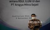 Ketua Umum ILUNI UI Andre Rahadian memberikan sambutan sebelum penandatanganan perjanjian kerja sama di RSUI, Kampus UI Depok, Jawa Barat, Jumat (5/11). Untuk mendukung operasional RSUI, Ikatan Alumni Univesitas Indonesia (ILUNI UI) bekerja sama dengan perusahaan Artifical Intelligence (AI) yaitu Arogya.ai menciptakan inovasi layanan kesehatan. Teknologi berbasis infrastruktur ICT (Tnformation and Communication Technology) ini memanfaatkan AI untuk mendukung supply chain dan adminstrasi rumah sakit.Prayogi/Republika. (FOTO : Prayogi/Republika.)