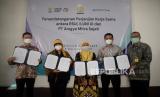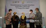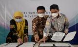(dari kiri) Direktur Utama Rumah Sakit Universitas Indonesia Astuti Giantini bersama CEO Arogya.ai Victor Fungkong dan Ketua Umum ILUNI UI Andre Rahadian melakukan penandatanganan perjanjian kerja sama di RSUI, Kampus UI Depok, Jawa Barat, Jumat (5/11). Untuk mendukung operasional RSUI, Ikatan Alumni Univesitas Indonesia (ILUNI UI) bekerja sama dengan perusahaan Artifical Intelligence (AI) Arogya.ai menciptakan inovasi layanan kesehatan. Teknologi berbasis infrastruktur ICT (Tnformation and Communication Technology) ini memanfaatkan AI untuk mendukung supply chain dan adminstrasi rumah sakit.Prayogi/Republika. (FOTO : Prayogi/Republika.)