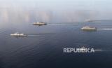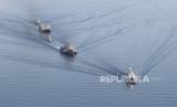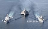 REPUBLIKA.CO.ID,JAKARTA -- KRI I Gusti Ngurah Rai (kiri), USS Jackson (tengah), KRI Diponegoro (kanan) melakukan parade saat kegiatan Cooperation Afloat Readiness And Training (CARAT) 2021 di laut Jawa, Jawa Timur, Selasa (9/11/2021).