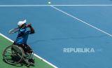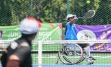 REPUBLIKA.CO.ID,JAYAPURA -- Ekspresi Petenis Papua Wahyudi usai menundukkan petenis DKI Jakarta Deby Iswanta dalam pertandingan tenis kursi roda beregu putra Nasional Peparnas XVI Papua di Sian Soor, Jayapura, Papua, Rabu (10/11/2021).