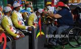 REPUBLIKA.CO.ID,JAYAPURA -- Tiga atlet tenis lapangan kursi roda beregu putra Papua berfoto usai penerimaan medali Peparnas XVI Papua di Sian Soor, Jayapura, Papua, Rabu (10/11/2021).