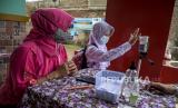 Pelajar diperiksa suhu tubuhnya sebelum memasuki area sekolah untuk mengikuti pembelajaran tatap muka terbatas (PTMT) di SDN 084 Cikadut, Jalan Jamaras, Kota Bandung, Jumat (12/11). Pemerintah Kota Bandung melalui Dinas Pendidikan Kota Bandung menyatakan, PTMT di 54 sekolah yang sempat ditutup sementara akibat persentase kasus Covid-19 diatas angka lima persen dari hasil tes acak PCR akan digelar kembali. Hal itu mengingat kondisi mayoritas pelajar dan guru yang telah sembuh serta proses 3T (tracing, testing dan treatment) yang hampir selesai. Foto: Republika/Abdan Syakura (FOTO : REPUBLIKA/ABDAN SYAKURA)